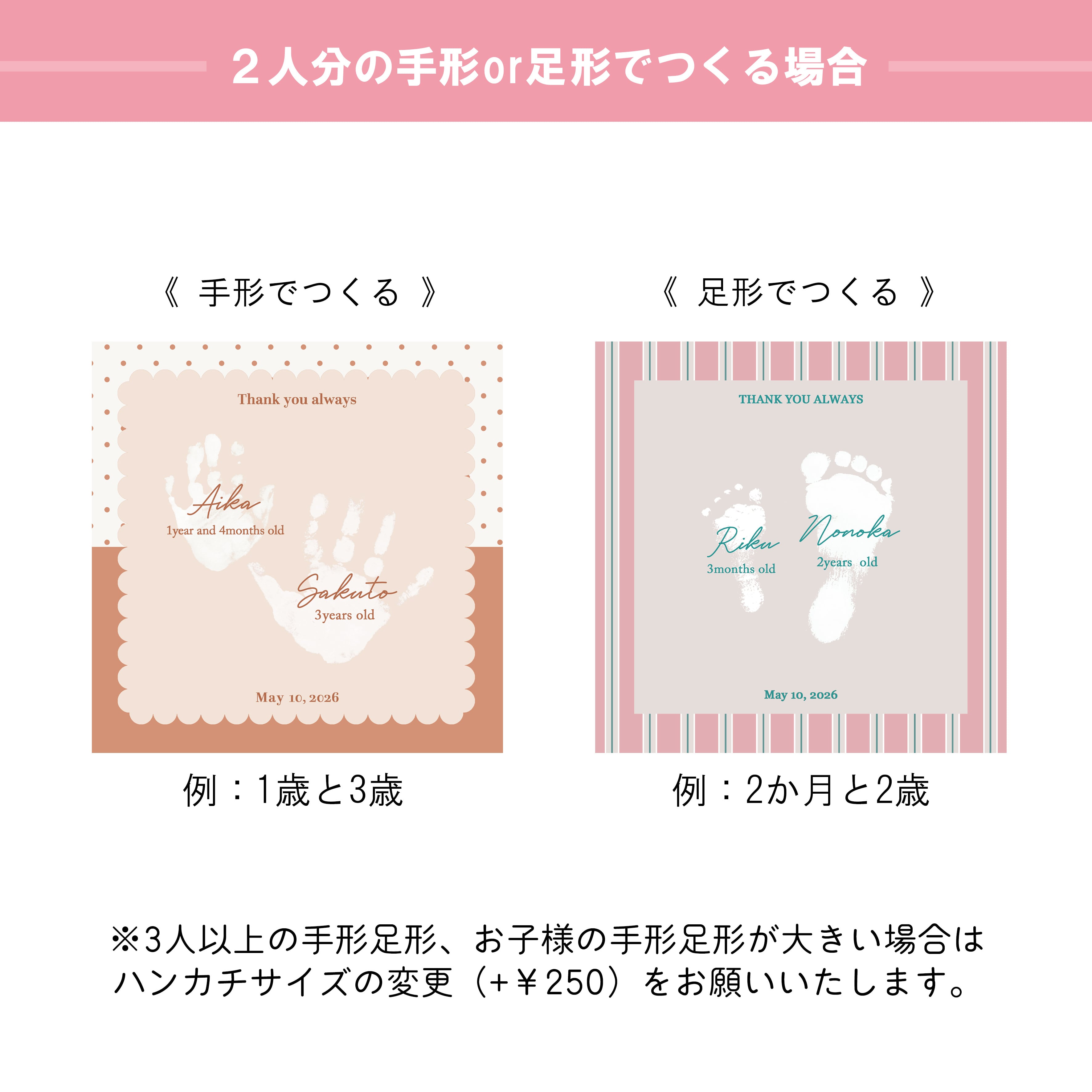 1枚のハンカチに二人まで手形足形を組み合わせてプリントすることも可能です。