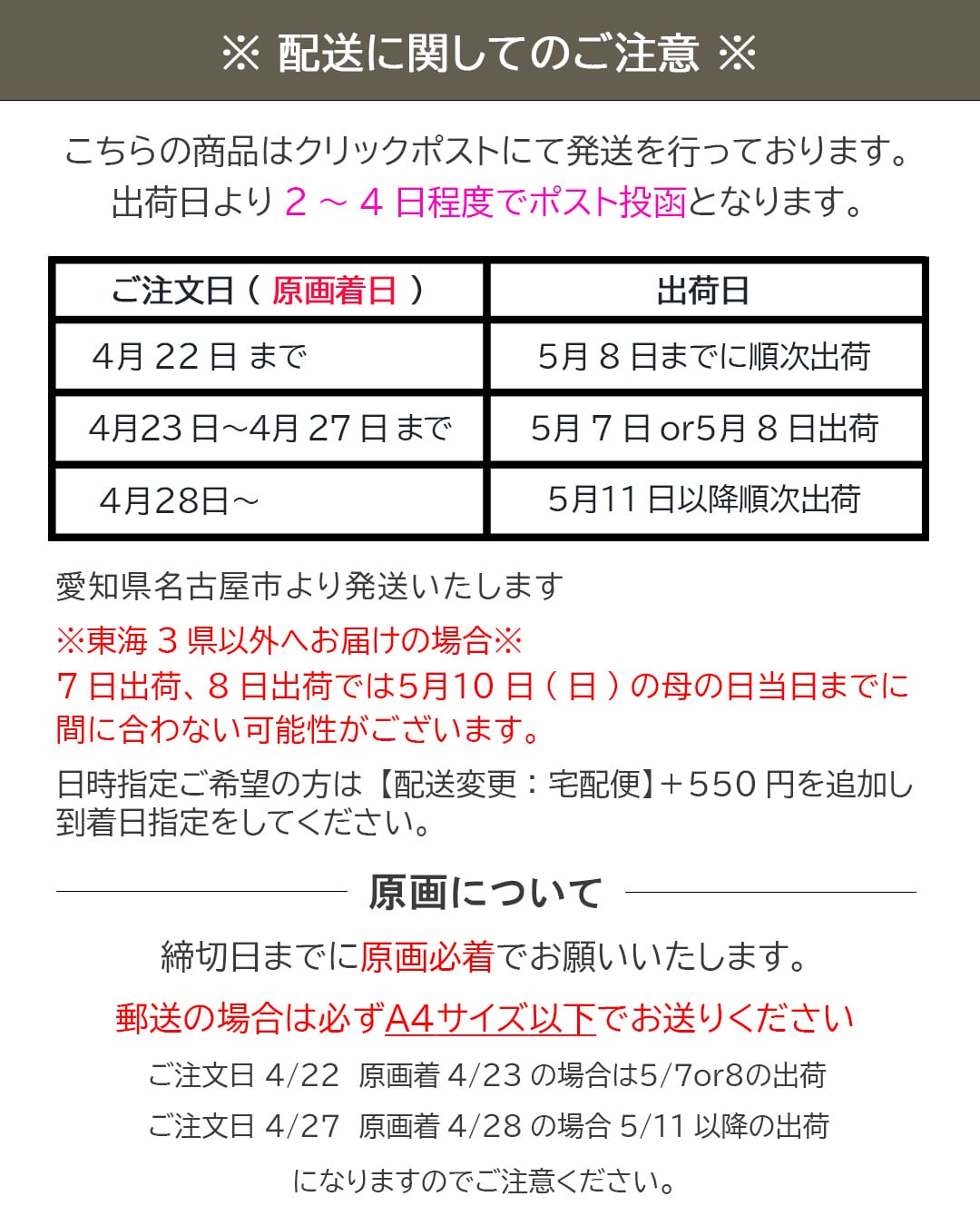 名古屋市からの発送となりますので、配送地域によって出荷日より2日~4日程度かかる場合がございます。お時間に余裕をもってご注文と原画送付をお願いいたします。