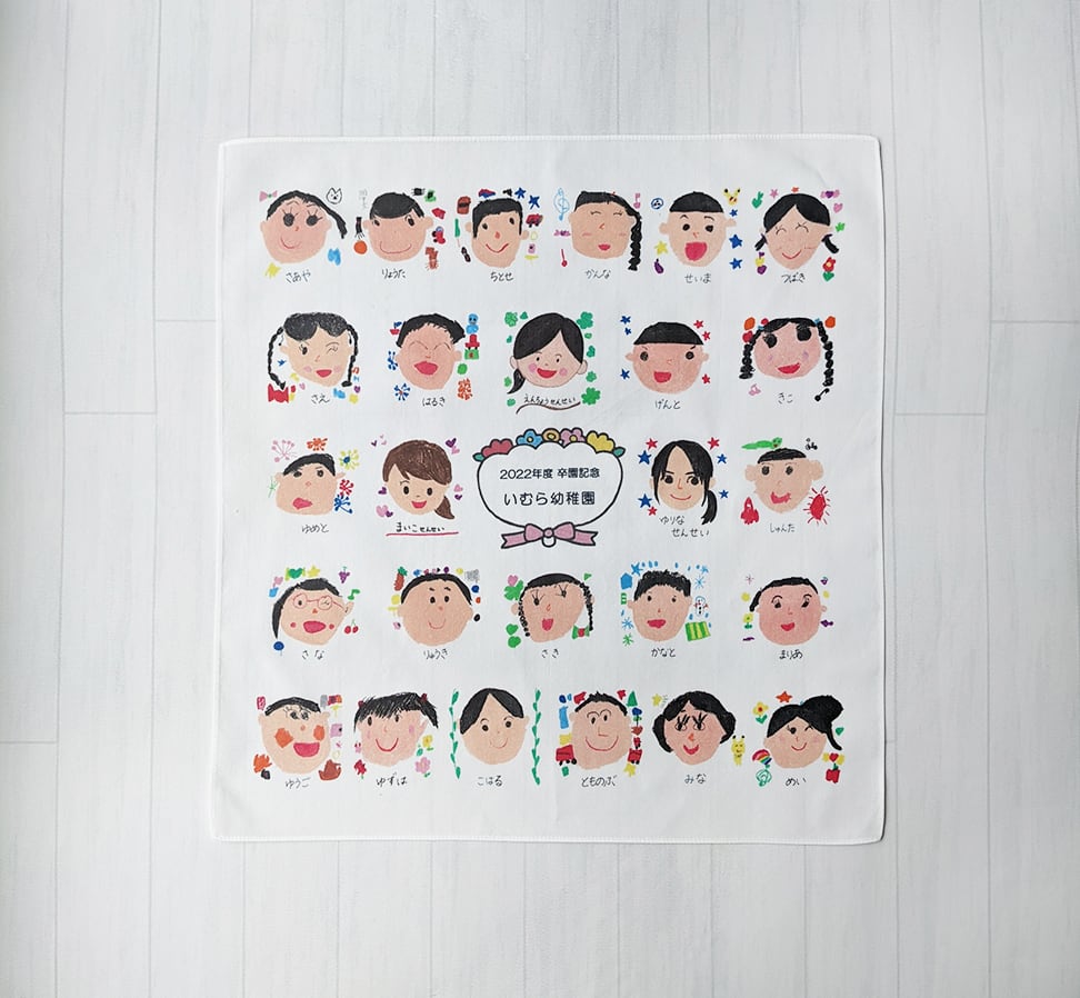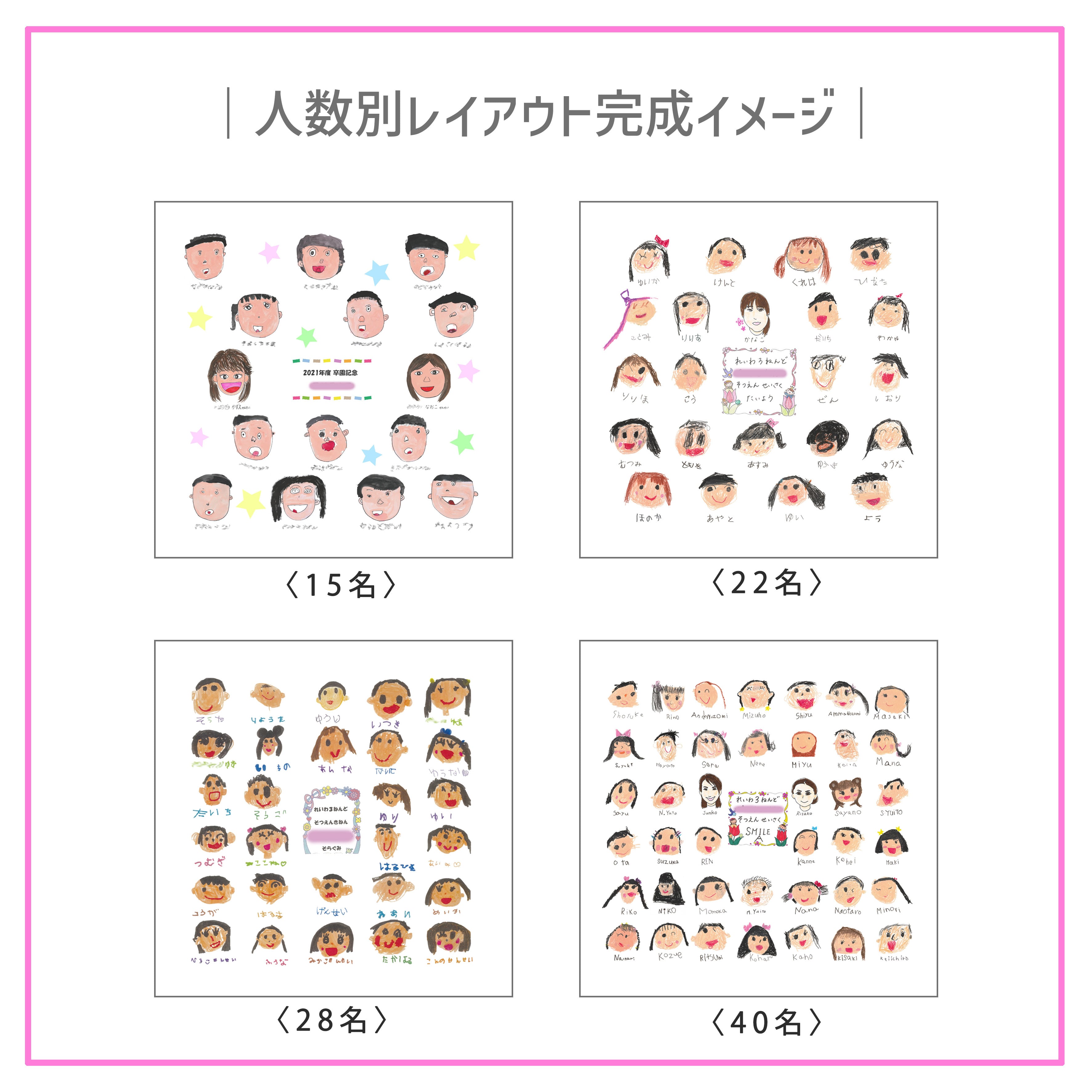 複数の絵を一枚にレイアウトした「寄せ書き風アレンジ」は卒園記念品として大変人気の商品です。