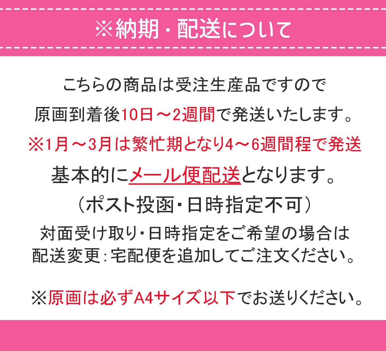 システムの都合上、2カ月で自動キャンセルとなってしまう為、ご注文確定後2週間以内に原画発送をお願いいたします。