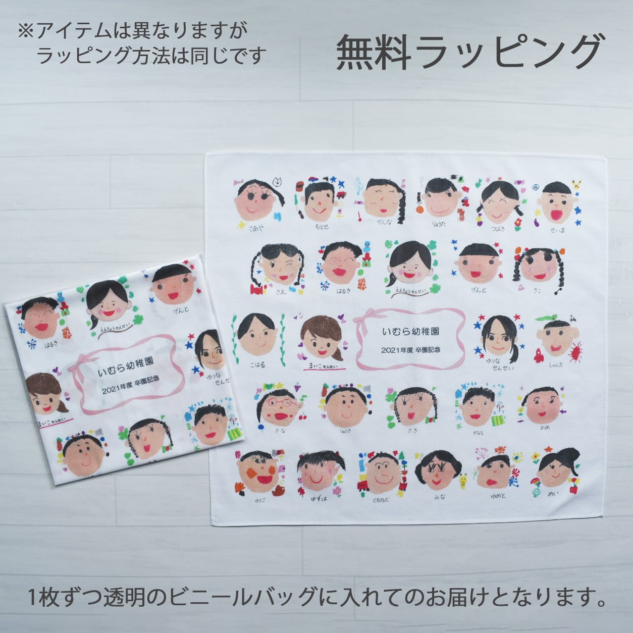 卒園年度や園名など名入れも可能ですのでデザインやレイアウトはご相談くださいませ。